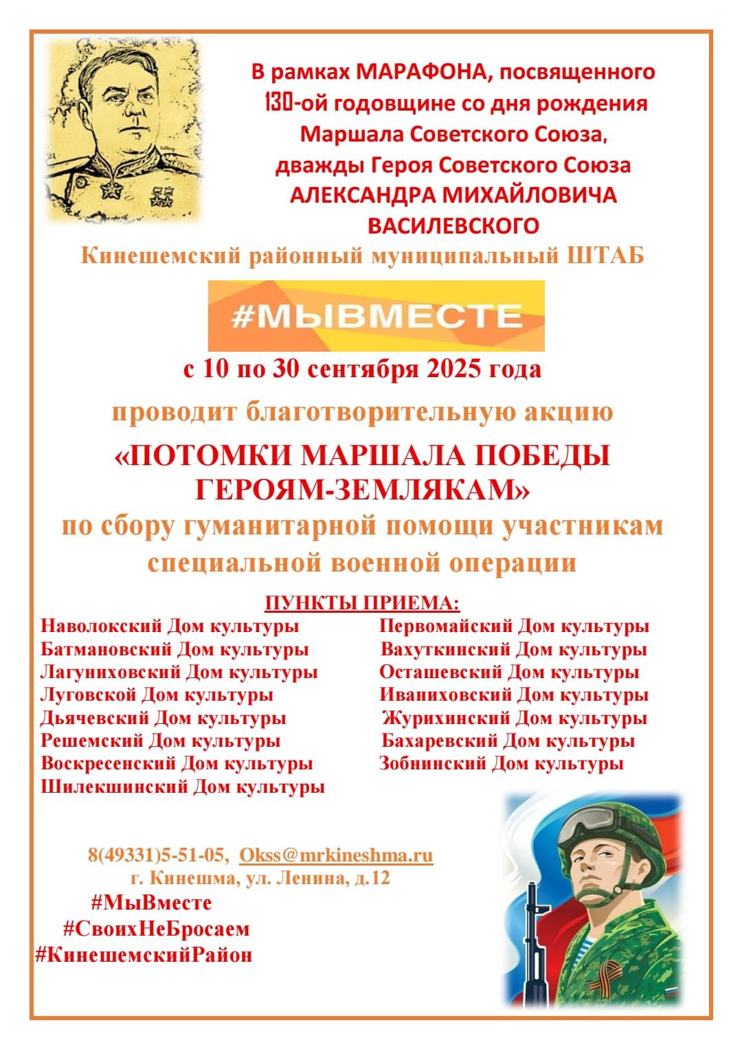 В Кинешемском районе с 10 по 30 сентября проходит благотворительная акция «Потомки маршала Победы героям-землякам», организованная муниципальным штабом «Мы вместе». Акция приурочена к 130-летию со дня рождения Маршала Советского Союза, дважды Героя Советского Союза Александра Михайловича Василевского.
